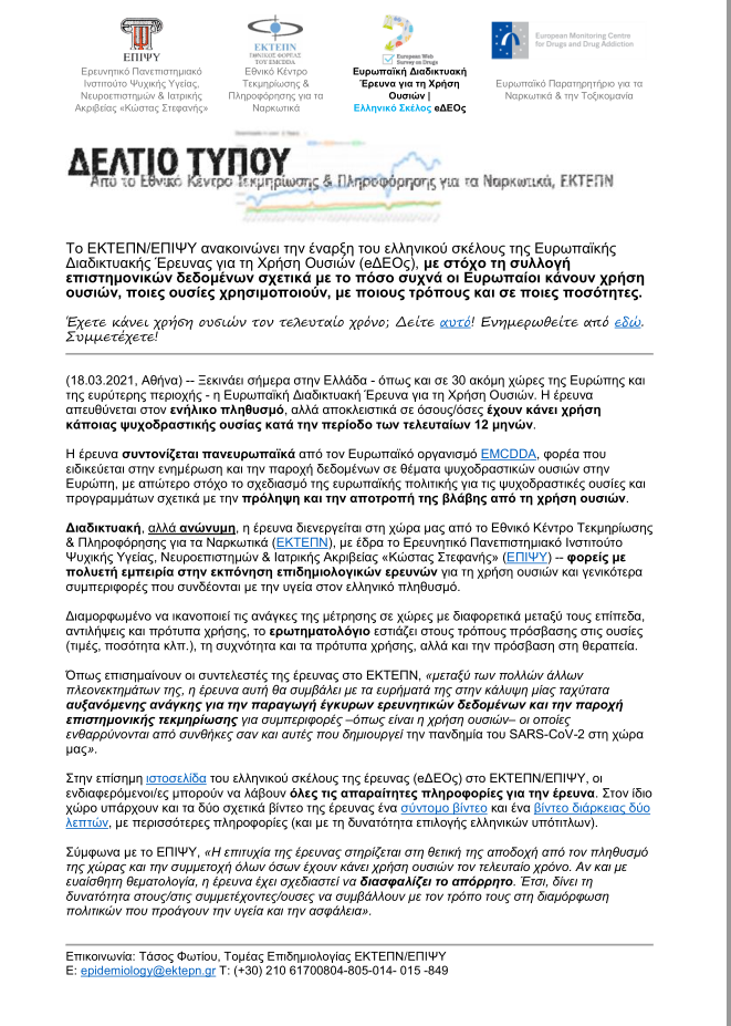 Μπορείς κι εσύ να συμμετάσχεις στην Πανευρωπαϊκή διαδικτυακή έρευνα για την χρήση ουσιών, η οποία σχεδιάστηκε από το EMCDDA (European Monitoring Center for Drugs and Drug Addiction) και συντονίζεται στην χώρα μας από το ΕΚΤΕΠΝ/ΕΠΙΨΥ (Εθνικό Κέντρο Τεκμηρίωσης και Πληροφόρησης για τα Ναρκωτικά/ Ερευνητικό Πανεπιστημιακό Ινστιτούτο Ψυχικής Υγείας).