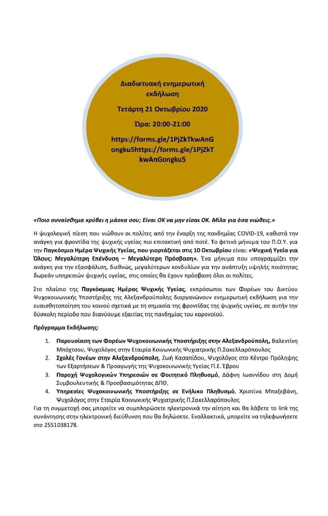 ΔΙΑΔΙΚΤΥΑΚΗ ΕΚΔΗΛΩΣΗ ΓΙΑ ΤΗΝ ΠΑΓΚΟΣΜΙΑ ΗΜΕΡΑ ΨΥΧΙΚΗΣ ΥΓΕΙΑΣ