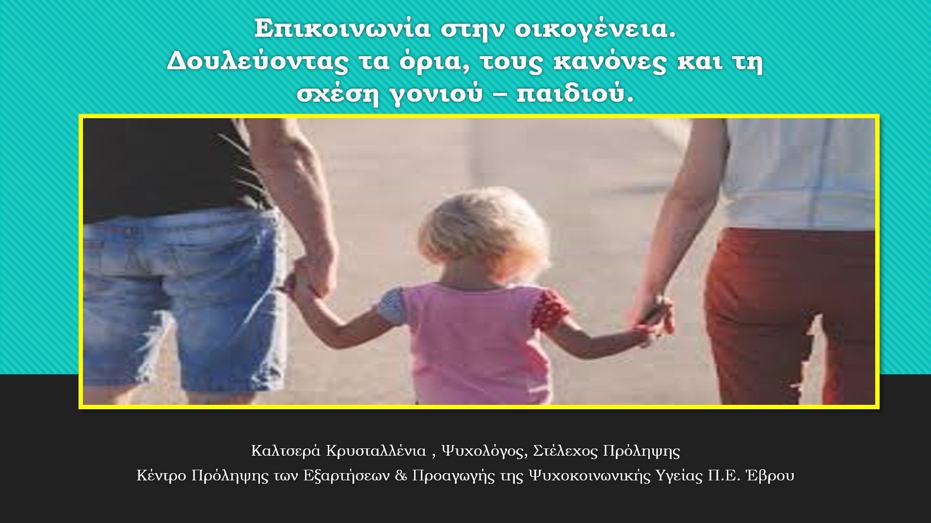 Μετά από αίτημα του 19ου Νηπιαγωγείου Αλεξανδρούπολης, το Κέντρο Πρόληψης Π.Ε. Έβρου, υλοποίησε την Τετάρτη 26 Ιανουαρίου 2022, ομιλία – συζήτηση, για τους γονείς του νηπιαγωγείου με τίτλο: «Επικοινωνία στην οικογένεια. Δουλεύοντας τα όρια, τους κανόνες και την σχέση γονιού και παιδιού». Ομιλήτρια ήταν η κα. Καλτσερά Κρυσταλλένια, Ψυχολόγος, Επιστημονικό Στέλεχος του Κέντρου Πρόληψης.