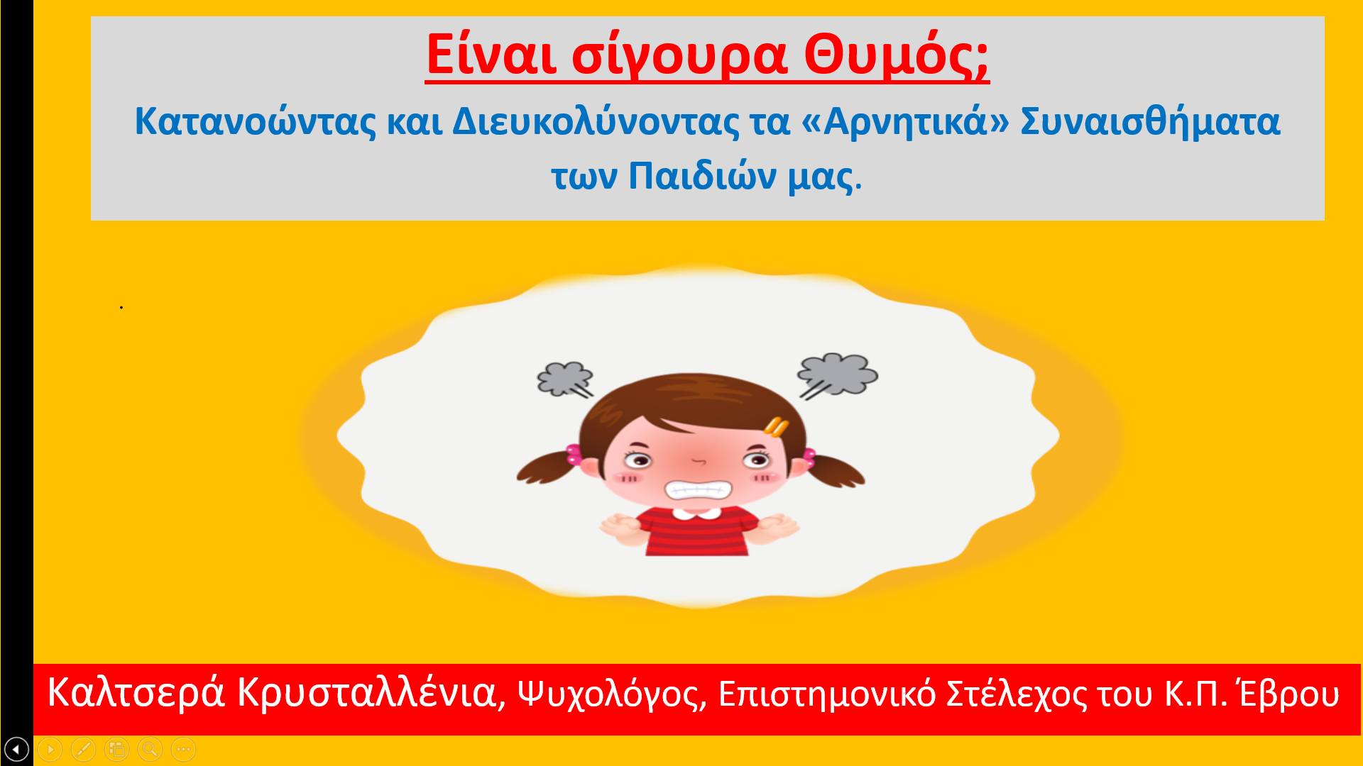 Μετά από αίτημα του Δημοτικού Σχολείου Ρυζίων πραγματοποιήθηκε διαδικτυακή ομιλία σε εκπαιδευτικούς και γονείς του σχολείου με θέμα: «Είναι σίγουρα Θυμός; Κατανοώντας και διευκολύνοντας τα «αρνητικά» συναισθήματα των παιδιών μας».Η ομιλία είχε ως στόχο να ενημερώσει και να ευαισθητοποιήσει σε ζητήματα σχετικά με την επικοινωνία και την έκφραση των συναισθημάτων. Την ομιλία, την οποία στήριξε με την παρουσία της και η Σχολική Σύμβουλος Εκπαίδευσης ΠΕ70, κα Ε. Δουλάμη, παρακολούθησαν 33 συμμετέχοντες. Την παρέμβαση υλοποίησε η κα Καλτσερά Κρυσταλλένια, Ψυχολόγος, Επιστημονικό Στέλεχος του Κέντρου Πρόληψης. Μετά το πέρας της εισήγησης, δόθηκε η δυνατότητα για συζήτηση με τους γονείς και τους εκπαιδευτικούς. Ευχαριστούμε θερμά όλους τους συμμετέχοντες.