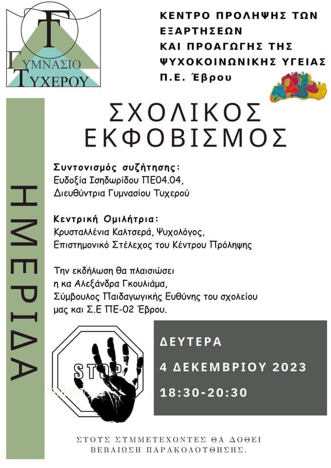 Την εκδήλωση πλαισίωνε η Δρ. Αλεξάνδρα Γκουλιάμα, Σύμβουλος παιδαγωγικής ευθύνης του Γυμνάσιου Τυχερού και Σ.ΕΠΕ 02 Έβρου και ο κος Βραχιώλιας Ευστράτιος, Ψυχολόγος, Επιστημονικά Υπεύθυνος Κέντρου Προληψης Π.Ε. Έβρου. Ευχαριστούμε θερμά όλους τους εκπαιδευτικούς για την συμμετοχή τους.