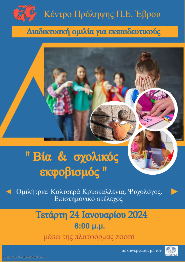 Με μεγάλη επιτυχία ολοκληρώθηκε η Διαδικτυακή ομιλία με θέμα: “Βία και σχολικός εκφοβισμός”, που αφορούσε τους εκπαιδευτικούς Πρωτοβάθμιας εκπαίδευσης.