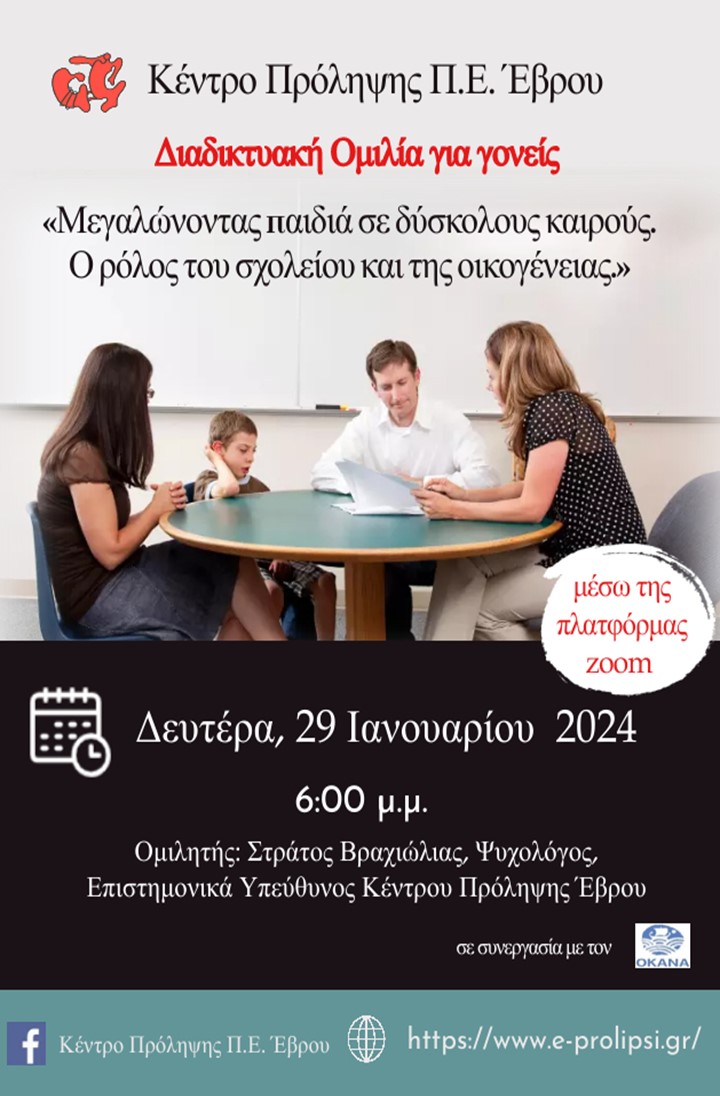 Ανταποκρινόμενοι σε αυξημένα αιτήματα που λαμβάνουμε από σχολικές μονάδες της Περιφερειακής Ενότητας Έβρου υλοποιήσαμε την διαδικτυακή ομιλία για γονείς που τα παιδιά τους φοιτούν στο Δημοτικό Σχολείο με θέμα: «Μεγαλώνοντας παιδιά σε δύσκολους καιρούς. Ο ρόλος του σχολείου και της οικογένειας.».