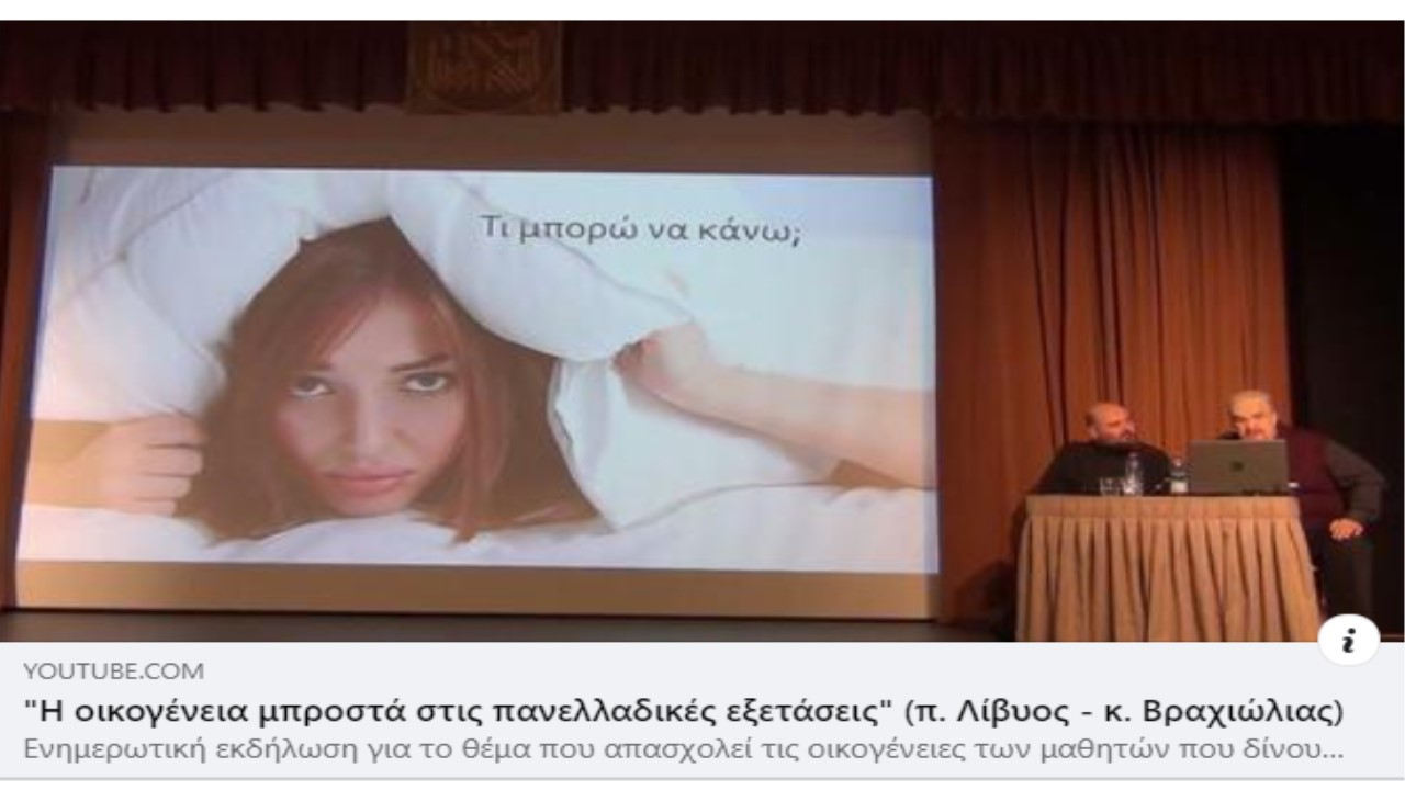 Ενημερωτική εκδήλωση με τίτλο: <<Η οικογένεια μπροστά στις πανελλαδικές εξετάσεις>> https://m.youtube.com/watch?si=IH1aLkMXfa9sa6Hd...