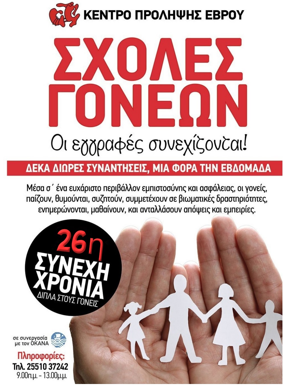 Με χαρά σας προσκαλούμε να εγγραφείτε στις ΣΧΟΛΕΣ ΓΟΝΕΩΝ του Κέντρου Πρόληψης που λειτουργούν στην πόλη μας δωρεάν, εδώ και 26 χρόνια. Σ΄ ένα κλίμα ζεστασιάς και ασφάλειας με πρωτότυπες εκπαιδευτικές τεχνικές, συζητάμε για τη σχέση μας με το παιδί μας και όλα αυτά που την υποστηρίζουν (επικοινωνία, αυτοεκτίμηση, έκφραση συναισθημάτων κλπ), μαθαίνουμε νέους τρόπους επικοινωνίας (πώς να μιλάμε, πώς να ακούμε, πώς να διαπραγματευόμαστε) και αλλάζουμε το κλίμα στην οικογένειά μας. Μόνη προϋπόθεση για τη συμμετοχή, η διάθεση για μάθηση και επικοινωνία! Τα μαθήματα πραγματοποιούνται από εξειδικευμένους επιστήμονες ψυχολόγους, κοινωνικούς λειτουργούς στους ειδικά διαμορφωμένους χώρους του Κέντρου Πρόληψης (Διονυσίου Σολωμού 2 , 3ος όροφος). Αναλυτικά μπορείτε να ενημερωθείτε από την ιστοσελίδα του Κέντρου Πρόληψης Π.Ε. Έβρου www.e-prolipsi.gr ή στο Facebook: Κέντρο Προληψης Π.Ε. Έβρου. Για τις εγγραφές σας επικοινωνήστε με τη γραμματεία του Κέντρου έως τη Δευτέρα 07 Οκτωβρίου 2024, στο τηλέφωνο 25510-37242 από 9.00 π.μ. – 13.00 μ.μ. Σε περίπτωση υπεράριθμων αιτήσεων θα τηρηθεί σειρά προτεραιότητας.