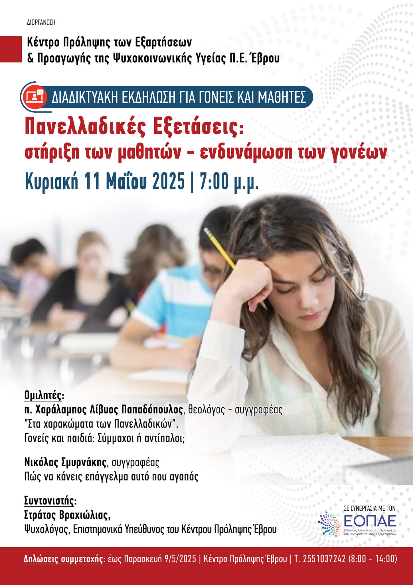 «Πανελλαδικές Εξετάσεις: στήριξη των μαθητών – ενδυνάμωση των γονέων», την Κυριακή 11 Μαΐου 2025 και ώρα 7:00 μ.μ.