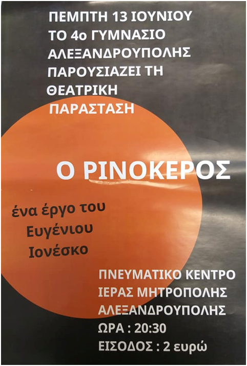 Πολλά συγχαρητήρια στους μαθητές και τους εκπαιδευτικούς του 4ου Γυμνασίου Αλεξανδρούπολης που συμμετείχαν στην διοργάνωση και την υλοποίηση της υπέροχης παράστασης «Ο Ρινόκερος», του Ιονέσκο, που πραγματοποιήθηκε την Πέμπτη 13 Ιουνίου το βράδυ στο Πνευματικό Κέντρο της Ιεράς Μητρόπολης Αλεξανδρούπολης.