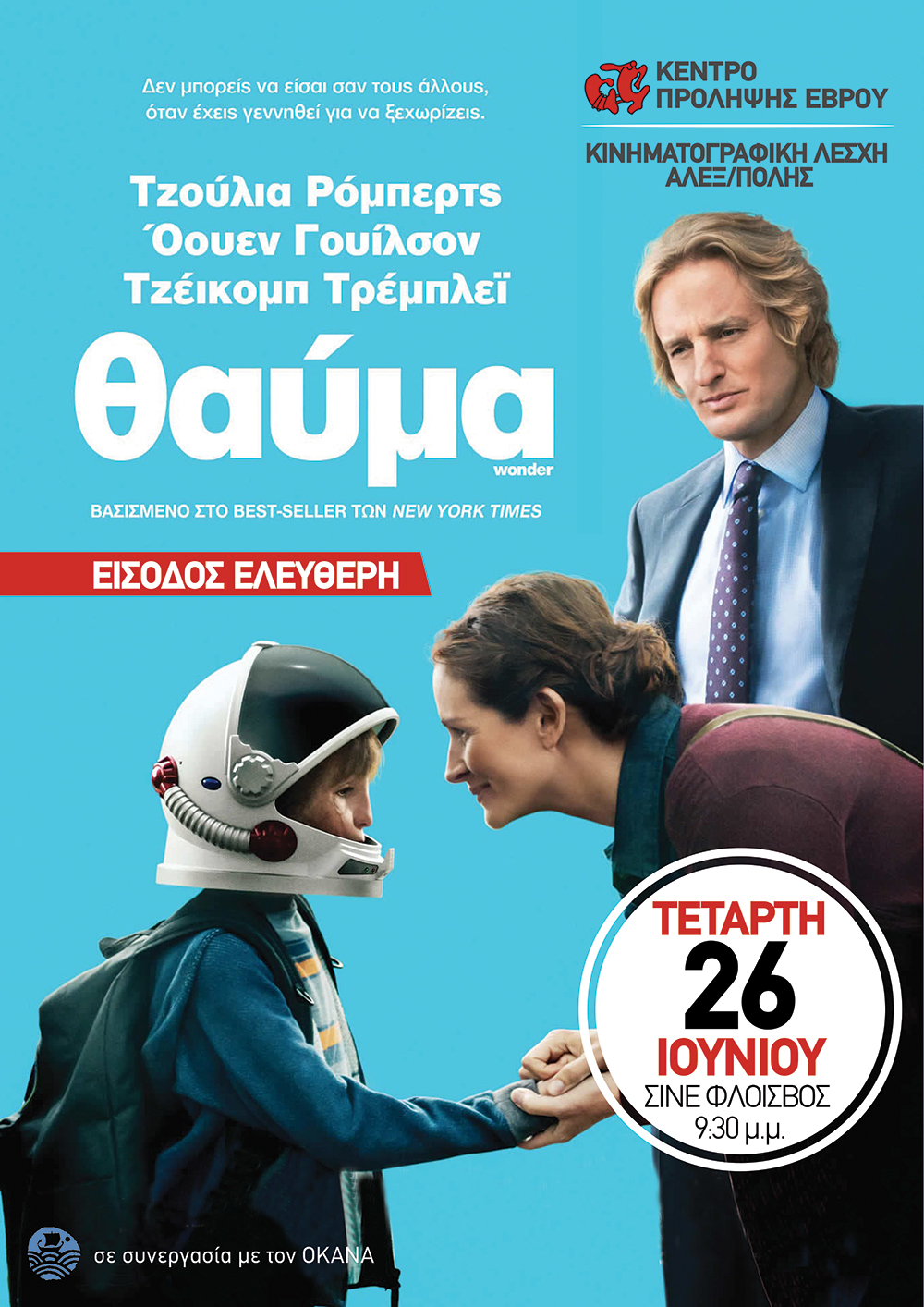 Με αφορμή την Παγκόσμια Ημέρα Κατά των Ναρκωτικών, το Κέντρο Πρόληψης των Εξαρτήσεων και Προαγωγής της Ψυχοκοινωνικής Υγείας Π.Ε. Έβρου, σε συνεργασία με την Κινηματογραφική Λέσχη Αλεξανδρούπολης, διοργανώνει εκδήλωση με προβολή της ταινίας «Θαύμα» σε σκηνοθεσία του Στίφεν Τσμπόσκυ στο θερινό κινηματογράφο Φλοίσβο (δίπλα στο Δημοτικό Camping Αλεξανδρούπολης) την Τετάρτη 26 Ιουνίου και ώρα 21:30 μ.μ.
