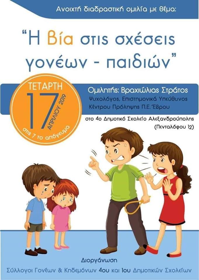 Διοργανώθηκε από τον Δντη και το Σύλλογο Διδασκόντων σε συνεργασία με το Σύλλογο Γονέων και Κηδεμόνων και το Κέντρο Πρόληψης Έβρου. Πραγματοποιήθηκε την Δευτέρα 8/4/2019 και ώρα 6:30 το απόγευμα στην αίθουσα εκδηλώσεων του 2ου Δημοτικού Σχολείου Διδυμοτείχου.